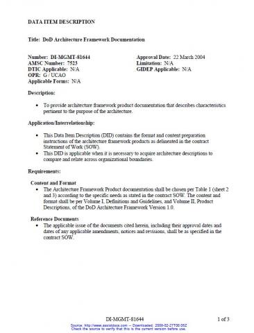 | DID- DoD Architecture Framework Documentation.PDF | application/pdf | 226.5 KB | English | DOWNLOAD! |