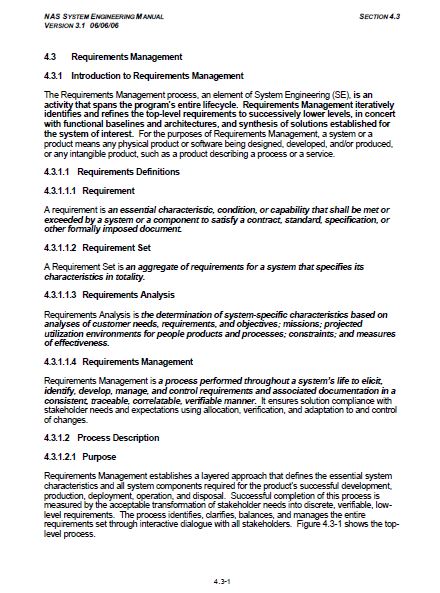 The Requirements Management process, an element of System Engineering (SE), is an activity that spans the program’s entire lifecycle. Requirements Management iteratively identifies and refines the top-level requirements to successively lower levels, in concert with functional baselines and architectures, and synthesis of solutions established for the system of interest. For the purposes of Requirements Management, a system or a product means any physical product or software being designed, developed, and/or produced, or any intangible product, such as a product describing a process or a service.
