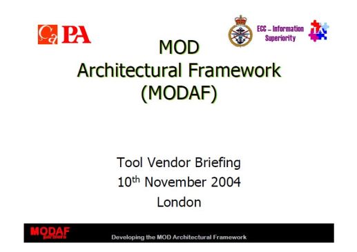 | MODAF Tool Vendor Briefing.pdf | application/pdf | 1.38 MB | English | DOWNLOAD! |