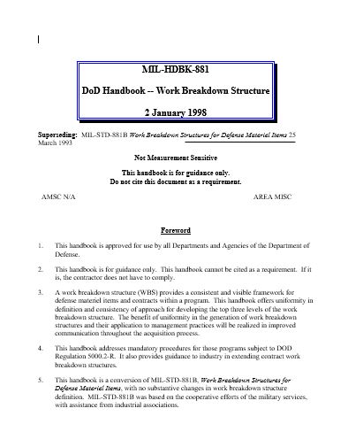 This handbook presents guidelines for preparing, understanding, and presenting a work breakdown structure (WBS). After the general purpose of work breakdown structures is discussed in Chapter 1, the handbook provides instructions on how to develop a program work breakdown structure (Program WBS) in Chapter 2. Chapter 3 offer guidance for developing and implementing a contract work breakdown structure (Contract WBS). Chapter 4 examines the role of the work breakdown structure in contract negotiation and award and in post-contract performance.