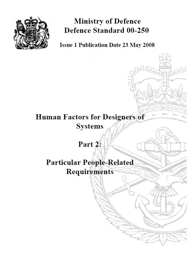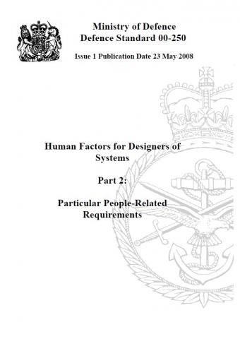 Defence Standard 00-250, Human Factors for Designers of Systems succeeds the previous Human Factors Defence Standard 00-25 (2004) of the same name. The Standard provides a structured presentation of Human Factors (HF) and Human Factors Integration (HFI) requirements, guidance and data, arranged to meet the needs of different types of user. It is focused on supporting the HF aspects of contracts between the Ministry of Defence (MoD) and industrial solution providers. The Standard comprises five Parts: