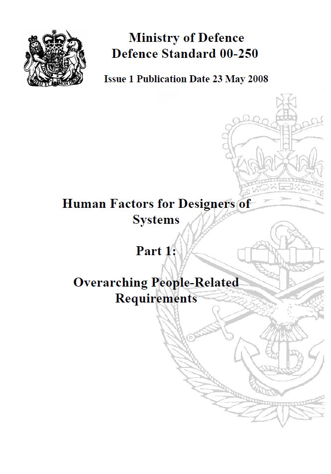 Defence Standard 00-250, Human Factors of Designers of Systems succeeds the previous Human Factors Defence Standard 00-25 (2004) of the same name. The Standard provides a structured presentation of Human Factors (HF) and Human Factors Integration (HFI) requirements, guidance and data, arranged to meet the needs of different types of user. It is focused on supporting the HF aspects of contracts between the Ministry of Defence (MoD) and industrial solution providers. The Standard comprises five Parts: