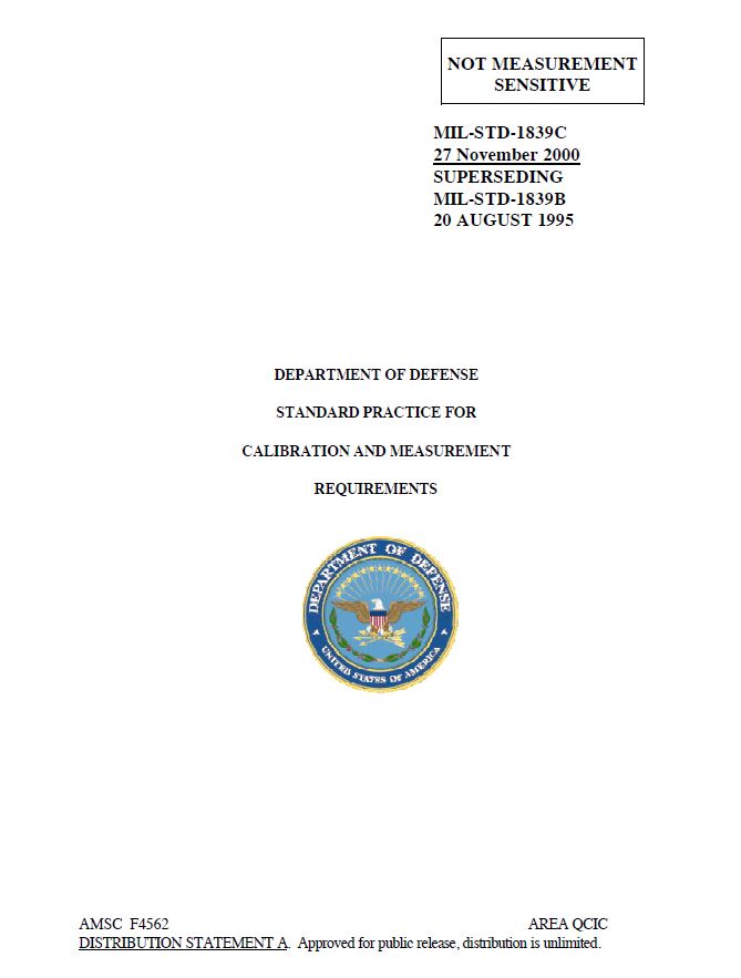 This standard describes the requirement to provide a means for calibration and measurement traceability of all system, subsystem, and equipment parameters to ensure system and equipment operational integrity and accuracy. It defines the requirement for establishing measurement traceability from actual system and equipment level measurements to the National Institute of Standards and Technology (NIST) or other approved measurement sources. These measurements are traced through properly selected and calibrated Test, Measurement, and Diagnostic Equipment (TMDE) or appropriate measurement sensors, through individual Military Department or commercial calibration facilities, to approved national measurement standards.