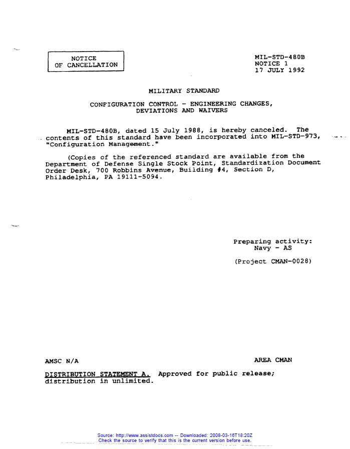 MIL-STD-480B, dated 15 July 1988, is hereby canceled. The contents of this standard have been incorporated into MIL-STD-973, 'Configuration Management.'