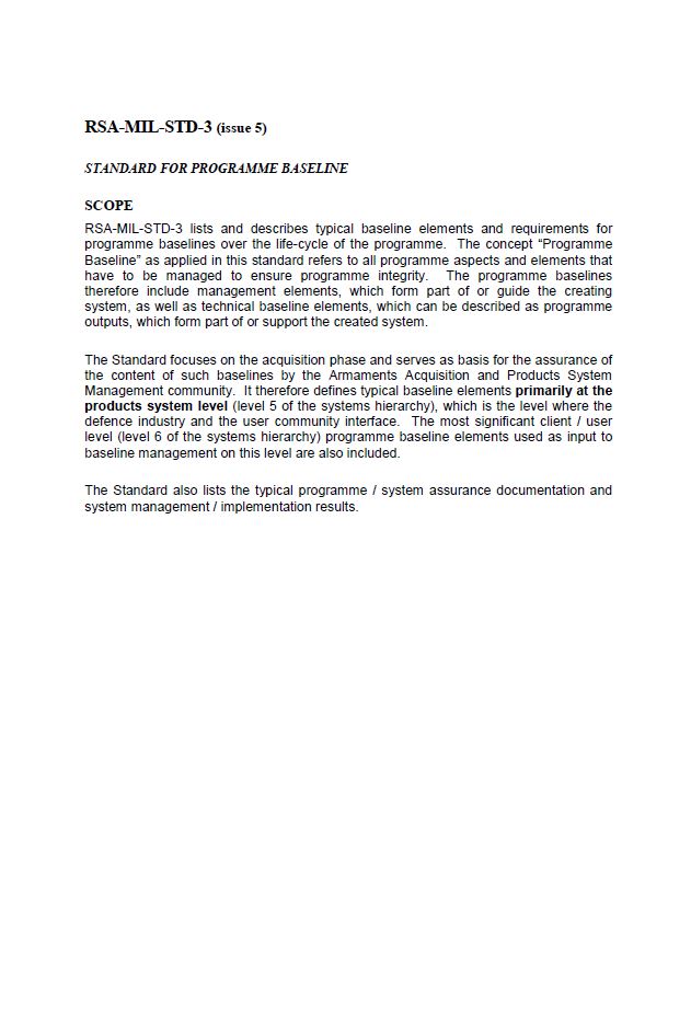 RSA-MIL-STD-3 lists and describes typical baseline elements and requirements for programm baselines over the life-cycle of the programme. The concept 'Programme Baseline' as applied to in this standard refers to all programme aspects and elements that have to be managed to ensure programme integrity. The programme baselines therefore include management elements, which form part of or guide the creating system, as well as technical baseline elements, which can be described as programme outputs, which form part or suppport the created system.