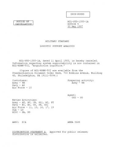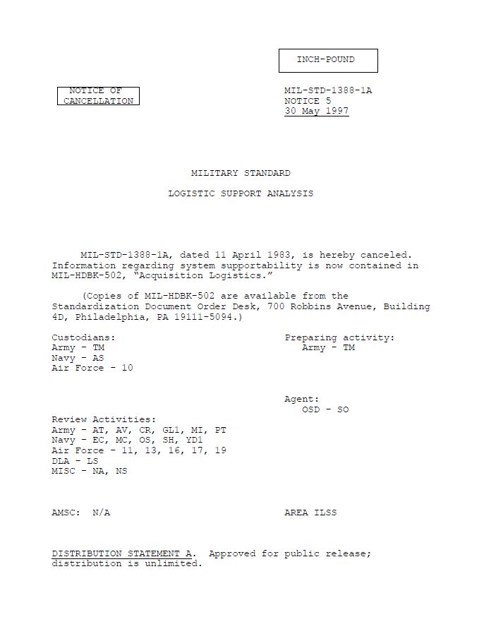 MIL-STD-1388-1A, dated 11 April 1983, is hereby canceled. Information regarding system supportability is now contained in MIL-HDBK-502, “Acquisition Logistics.”