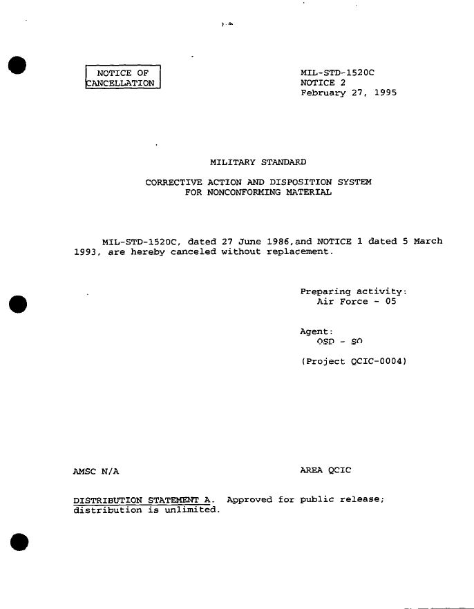 MIL-STD-1520C, dated 27 June 1986,and NOTICE 1 dated 5 March 1993, are hereby canceled without replacement.