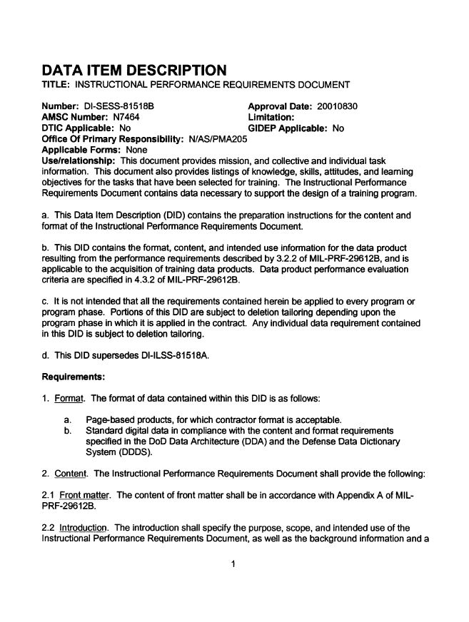 a. This Data Item Description (DID) contains the preparation instructions for the content and format of the Instructional Performance Requirements Document.