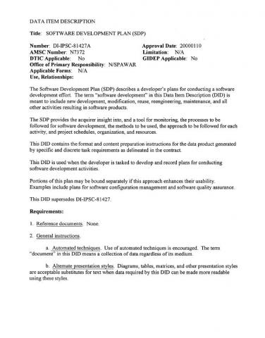The Software Development Plan (SDP) described a developer's plans for conducting a software development effort. The term 'software development' in this Data Item Description (DID) is meant to include new development, modification, reuse, re-engineering, maintenance, and all other activities resulting in software products. The SDP provides the acquirer insight into, and a tool for monitoring, the processes to be followed for software development, the methods to be used, the approach to be followed for each activity, and project schedules, organization and resources. This DID contains the format and content preparation instructions for the data product generated by specific and discrete task requirements as delineated in the contract. This DID is used when the developer is tasked to develop and record plans for conducting software development activities.Portions of this plan may be bound separately if this approach enhances their usability. Examples include plans for software configuration management and software quality assurance. This DID supersedes DI0IPSC-81427.