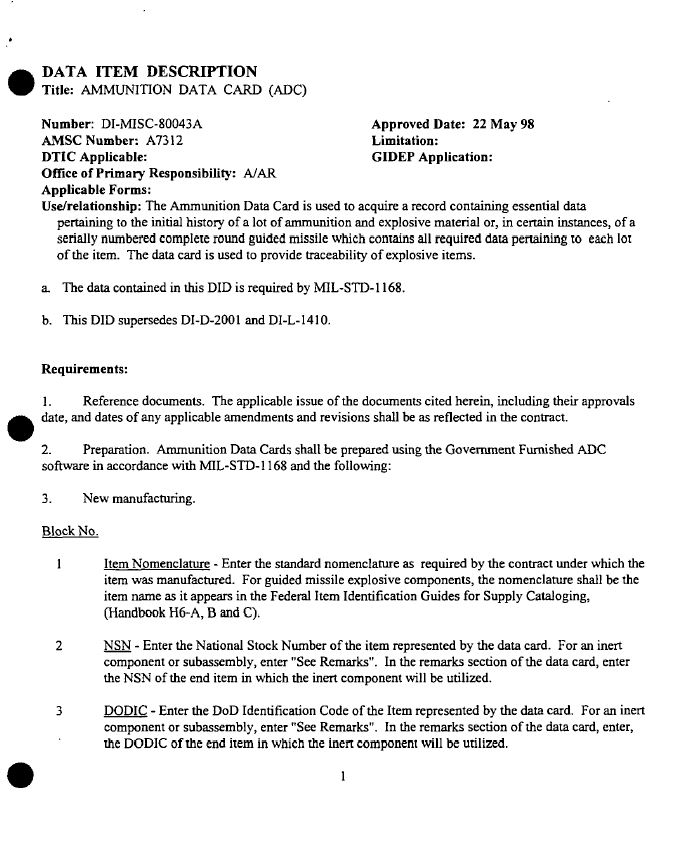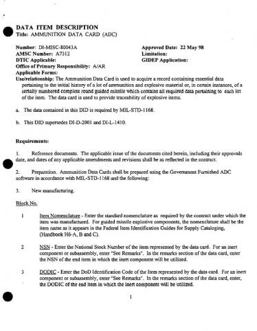 The Ammunition Data Card is used to acquire a record containing essential data pertaining to the initial history of a lot of ammunition and explosive material or, in certain instances, of a serially numbered complete round guided missile which contains all required data pertaining to each lot of the item. The data card is used to provide traceability of explosive items.