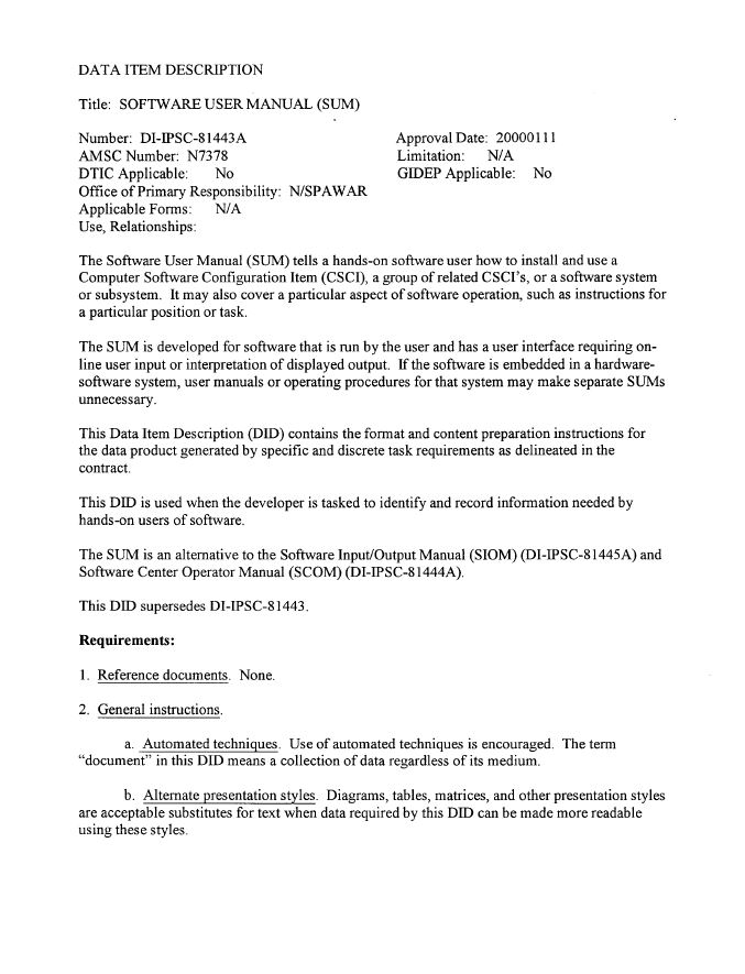 The Software User Manual (SUM) tells a hands-on software user how to install and use a Computer Software Configuration Item (CSCI), a group of related CSCI's, or a software system or subsystem. It may also cover a particular aspect of software operation, such as instructions for a particular position or task.
