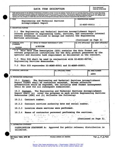 The Engineering and Technical Services Accomplishment Report shall be contractor selected. Unless effective presentation would be degraded, the initially used format arrangement shall be used for all subsequent submissions.