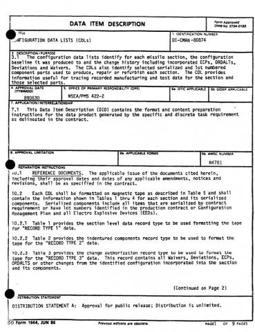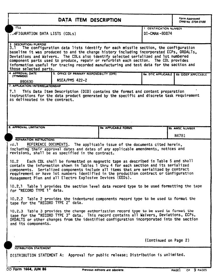 3.1 The Configuration data lists identify for each missile section, the configuration baseline it was produced to and the change history including incorporated ECPs, ORDALTs, Deviations and Waivers. The CDLs also identify selected serialized and lot numbered component parts used to produce, repair or refurbish each section. The CDL provides information useful for tracing recorded manufacturing and test data for the section and those selected parts.