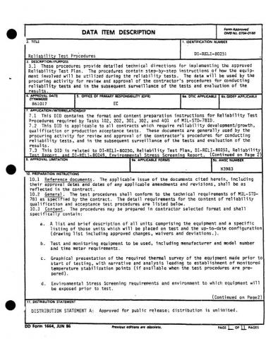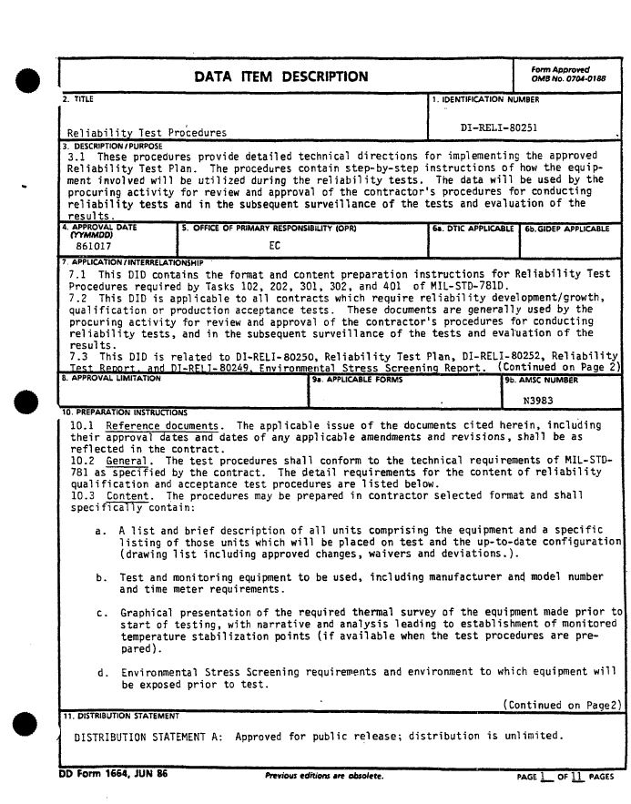 3.1 These procedures provide detailed technical directions for implementing the approved Reliability Test Plan. The procedures contain step-by-step instructions of how the equipment involved will be utilized during the reliability tests. The data will be used by the procuring activity for review and approval of the contractor's procedures for conducting reliability tests and in the subsequent surveillance of the tests and evaluation of the results.