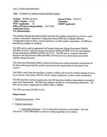The IDD can be used to supplement the System/Subsystem Design Description (SSDD) (DI-IPSC-81432A), Software Design Description (SDD) (DI-IPSC-81435A), and Database Design Description (DBDD) (DI-IPSC-81437A). The DID and its companion Interface Requirements Specification (IRS) (DI-IPSC-81434A) serve to communicate and control interface design decisions.