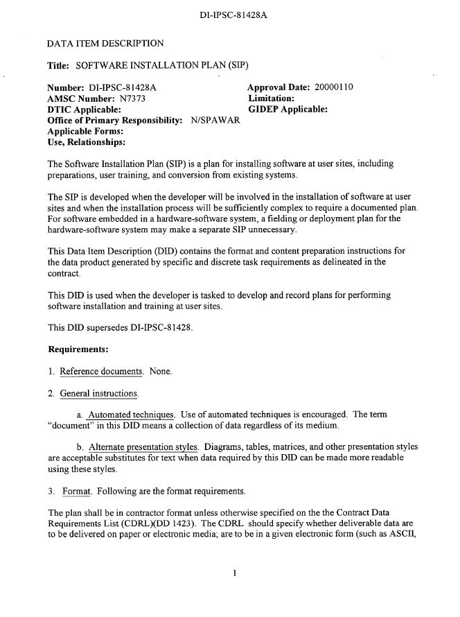 This Software Installation Plan (SIP) is a plan for installing software at user sites, including preparations, user training, and conversion from existing systems.
