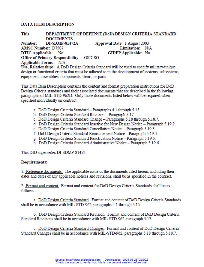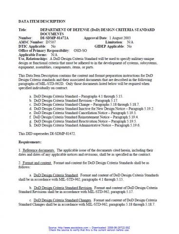 This Data Item Description contains the content and format preparation instructions for DoD Design Criteria standards and their associated documents that are described in the following paragraphs of MIL-STD-962D. Only those documents listed below will be required when specified individually on contract.