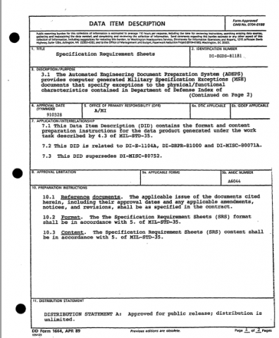 10.2 Format. The Specification Requirements Sheets (SRS) format shall be in accordance with 5. of MIL-STD-35.