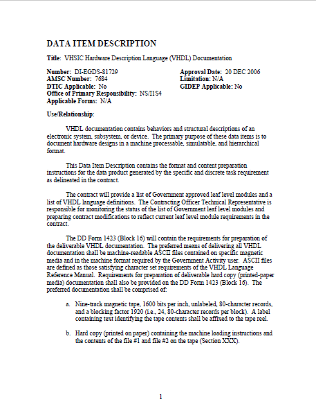 VHDL documentation contains behaviors and structural descriptions of an electronic system, subsystem, or device. The primary purpose of these data items is to document hardware designs in a machine processable, simulatable, and hierarchical format.