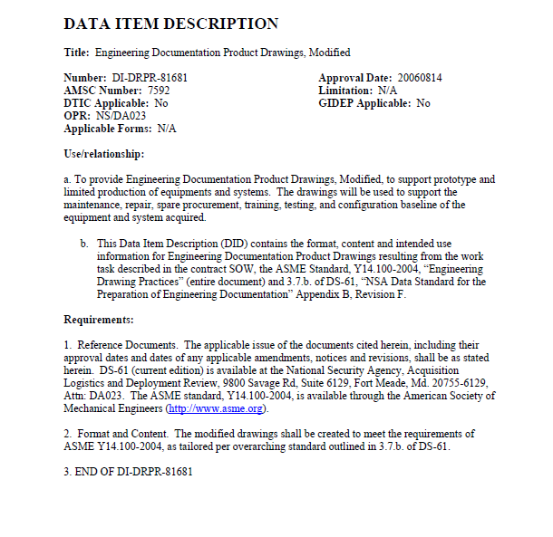 b. This Data Item Description (DID) contains the format, content and intended use information for Engineering Documentation Product Drawings resulting from the work task described in the contract SOW, the ASME Standard, Y14.100-2004, “Engineering Drawing Practices” (entire document) and 3.7.b. of DS-61, “NSA Data Standard for the Preparation of Engineering Documentation” Appendix B, Revision F.