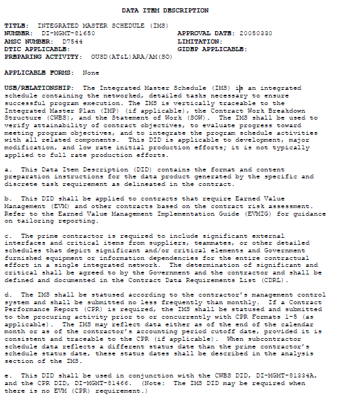 USE/RELATIONSHIP: The Integrated Master Schedule (IMS) is an integrated schedule containing the networked, detailed tasks necessary to ensure successful program execution. The IMS is vertically traceable to the Integrated Master Plan (IMP) (if applicable), the Contract Work Breakdown Structure (CWBS), and the Statement of Work (SOW). The IMS shall be used to verify attainability of contract objectives, to evaluate progress toward meeting program objectives, and to integrate the program schedule activities with all related components. This DID is applicable to development, major modification, and low rate initial production efforts; it is not typically applied to full rate production efforts.