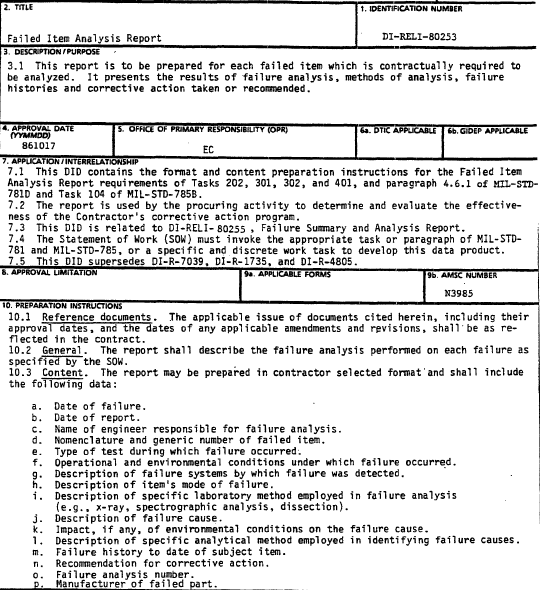This report is to be prepared for each failed item which is contractually required to by analyzed. It represents the results of failure analysis, methods of analysis, failure histories and corrective action taken or recommended.
