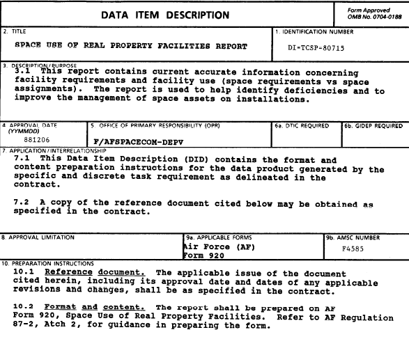 This report contains current accurate information concerning facility requirements and facility use (space requirements vs space assignments). The report is help to identify deficiencies and to improve the management of space assets on installations.
