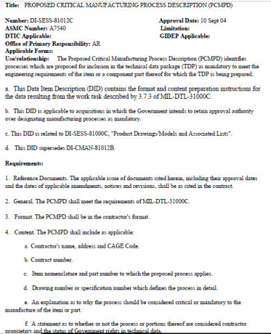 The Proposed Critical Manufacturing Process Description (PCMPD) identifies processes which are proposed for inclusion in the technical data package (TDP) as mandatory to meet the engineering requirements of the item or a component part thereof for which the TDP is being prepared.