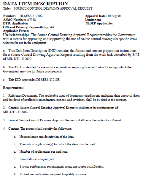 The Source Control Drawing Approval Request provides the Government with a means for approving or disapproving the use of source control drawings for specific items selected for use in the equipment.